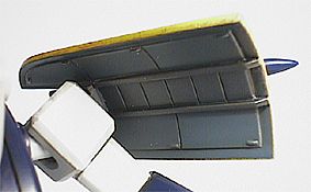 モモ裏のスジ彫りは降着状態の設定画で「モモは立ったまま、膝関節からのアームが後面に食い込むように後方へ移動している」絵に沿ったモノ。このスタイルのモールドを最初にしたのはMAXファクトリーのダイビングビートルで、以後各社のキットでも取り入れられて共通認識的なのものになっている。 |